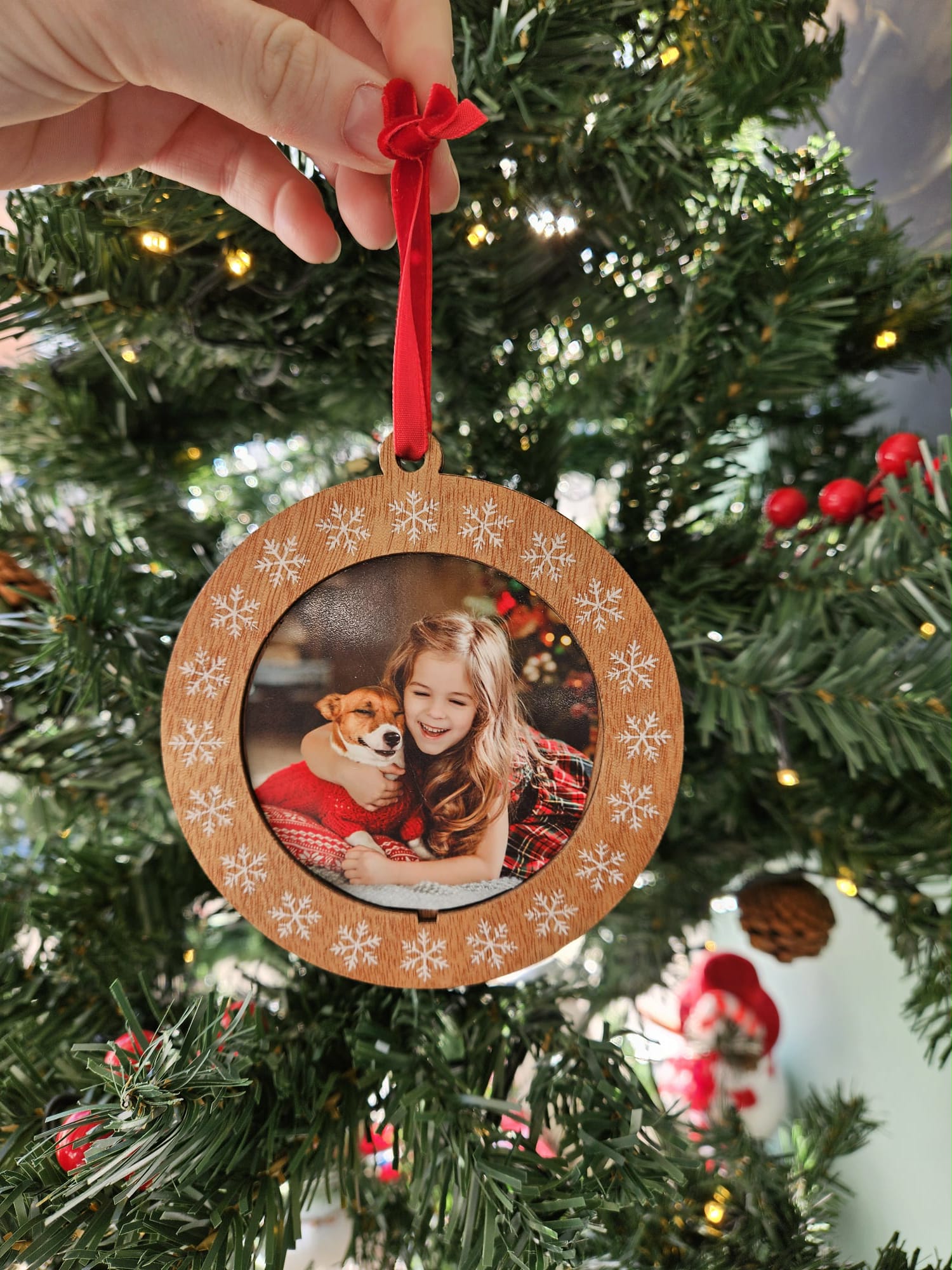 Get ready to add a truly personal touch to your Christmas tree with this beautiful circular wooden bauble that showcases your favourite photo in festive style!