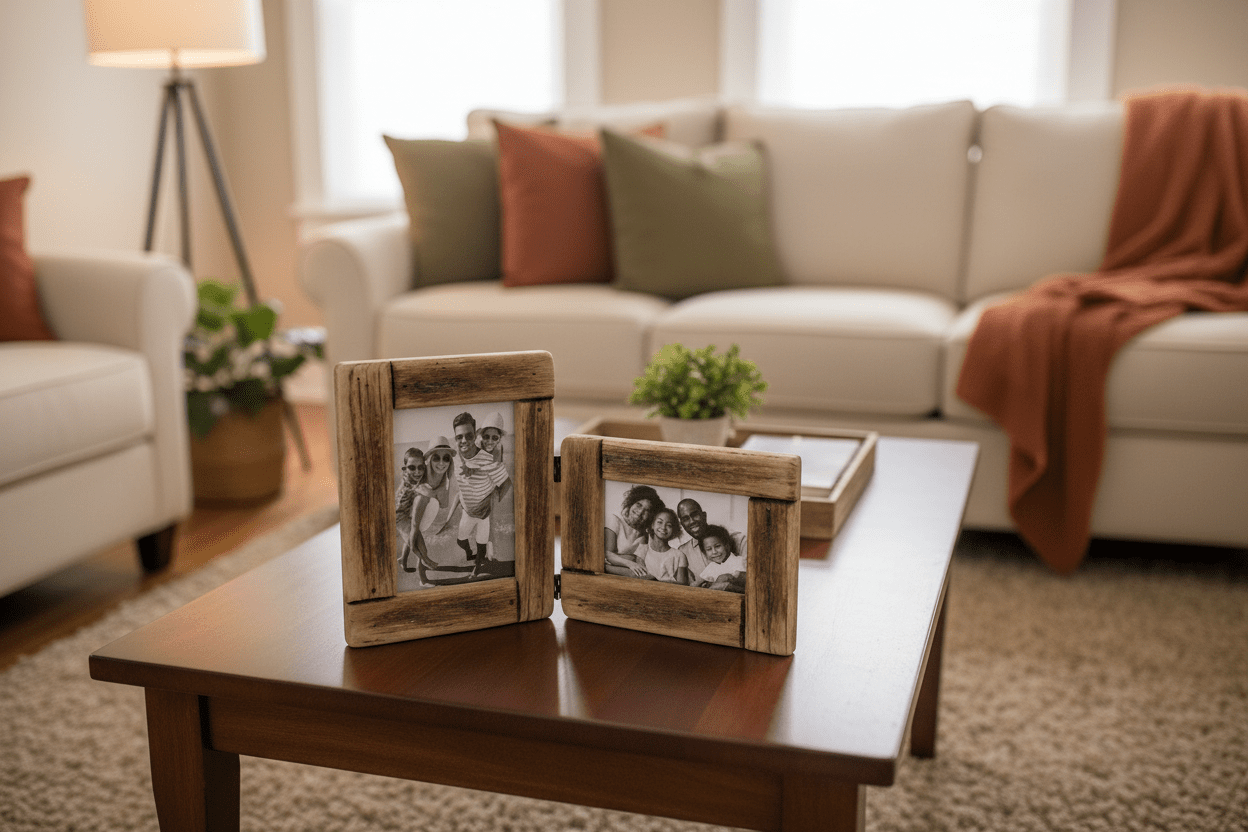 Display two cherished moments side by side with this charming folding wooden frame. The rustic, rough-hewn design holds one 7x5... Read more